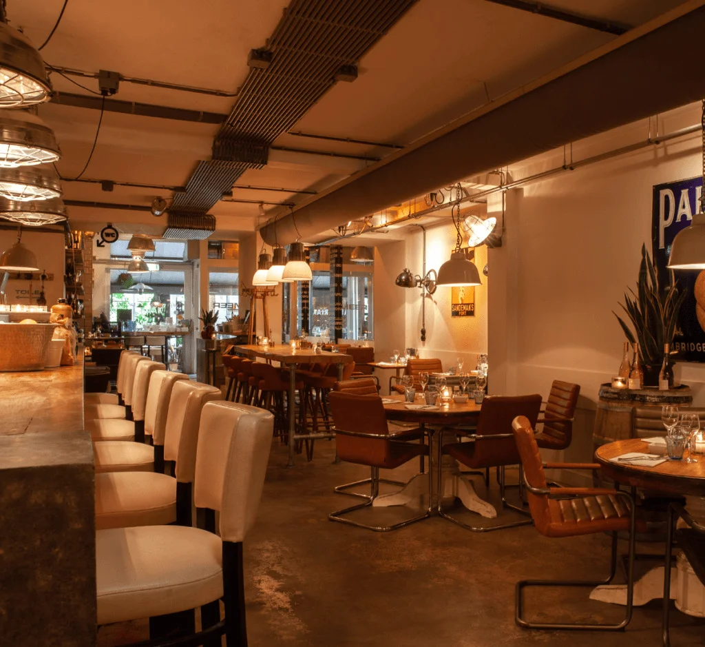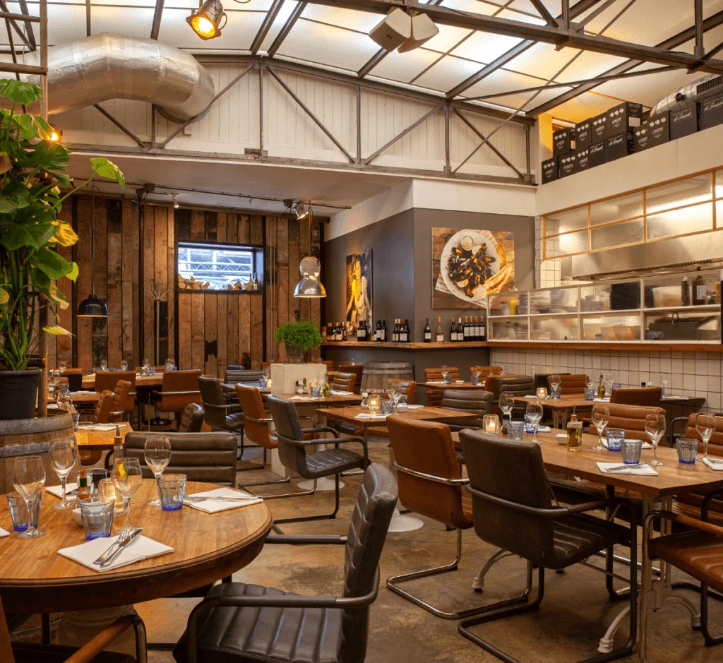 Tucked into the lively Drieharingstraat—one of Utrecht’s coziest little lanes—Restaurant VIS&MEER brings a touch of old Marseille to the heart of the city. Once a humble mattress shop, the space was transformed by owners John Elzinga and Peter Bijl de Vroe into a bright, high-ceilinged restaurant with warm industrial charm: reclaimed wood, concrete floors, steel accents, and an open kitchen that sets the tone for a vibrant dining experience.